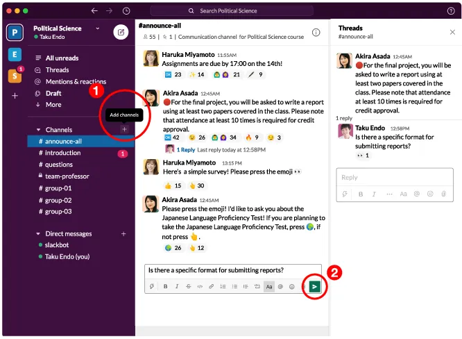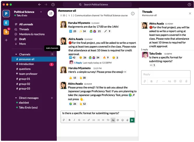 Here we introduce how to use Slack effectively in class. As an example, we will use a fictitious course called “Political Science”.
