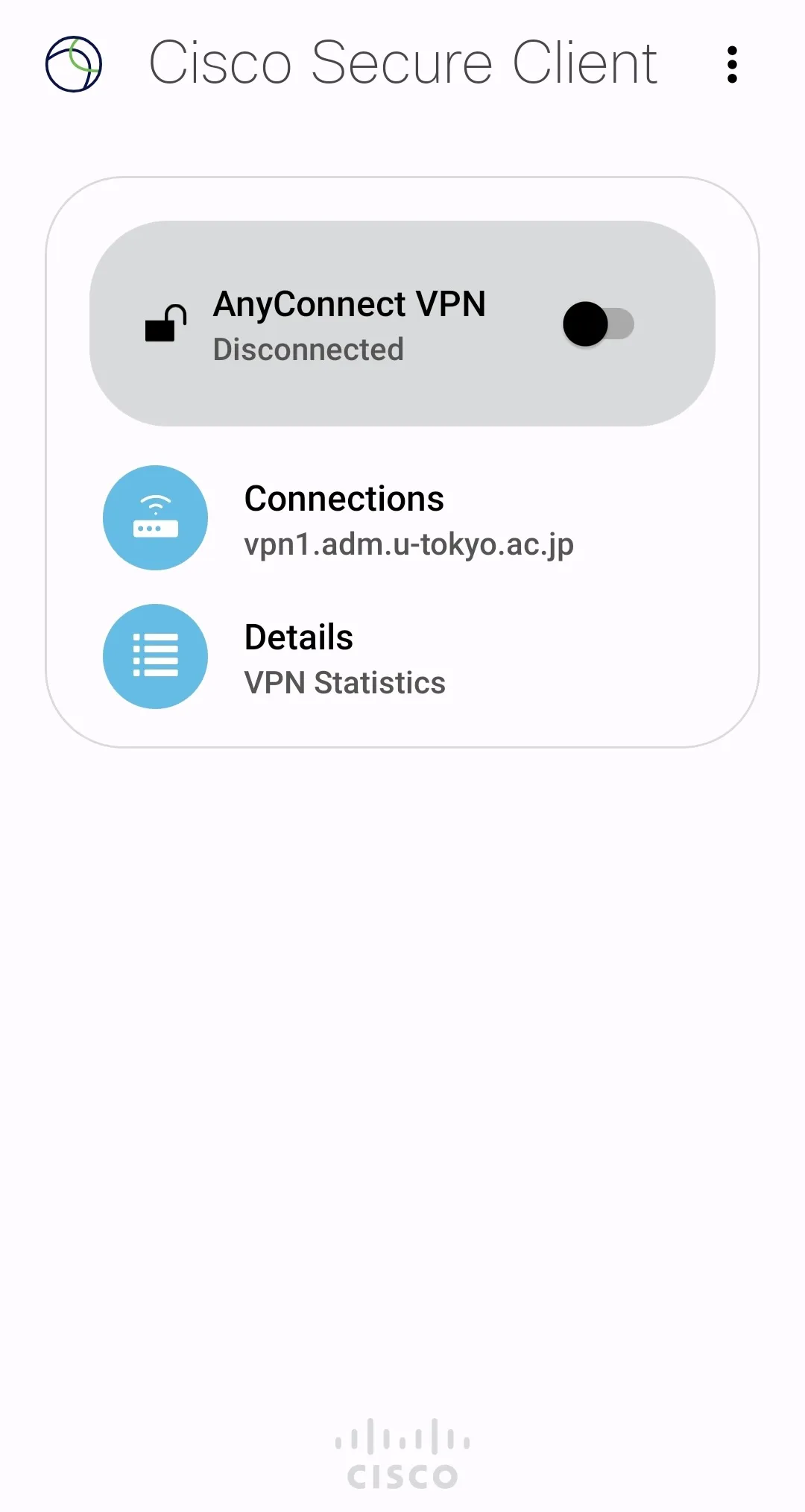 Step E: Confirm that “vpn1.adm.u-tokyo.ac.jp” is listed under “Connections” as shown in the first image below. Next, turn on the toggle button next to “AnyConnect VPN” and sign in with your UTokyo Account when the UTokyo Account authentication screen appears as shown in the second image below. If you launch the VPN shortly after your previous access, the VPN connection may start immediately without displaying this screen.