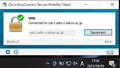 Step H: To view the current connection status, click on the “Cisco AnyConnect Secure Mobility Client” icon again. If the window displaying “Connected to vpn1.adm.u-tokyo.ac.jp” illustrated below appears, your device is connected to the UTokyo VPN.