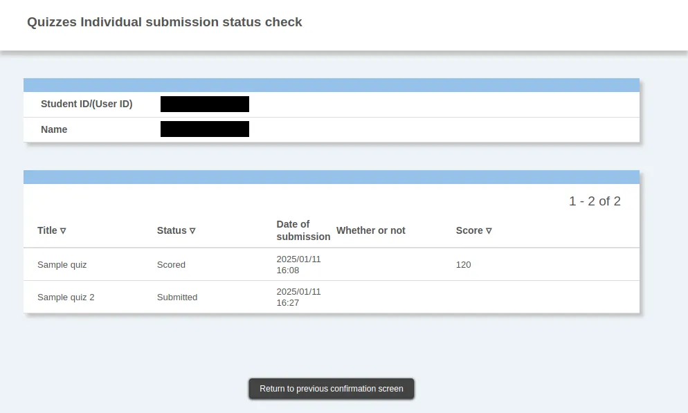 • You can check the submission status of only that student by clicking on the student number (or Common ID) on the “Overall submission status check” screen.