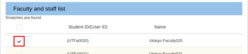 • A user whose UTokyo Account has the status of both “Faculty staff” and “Student” can be searched with both “Search student” and “Search a faculty and staff”.
