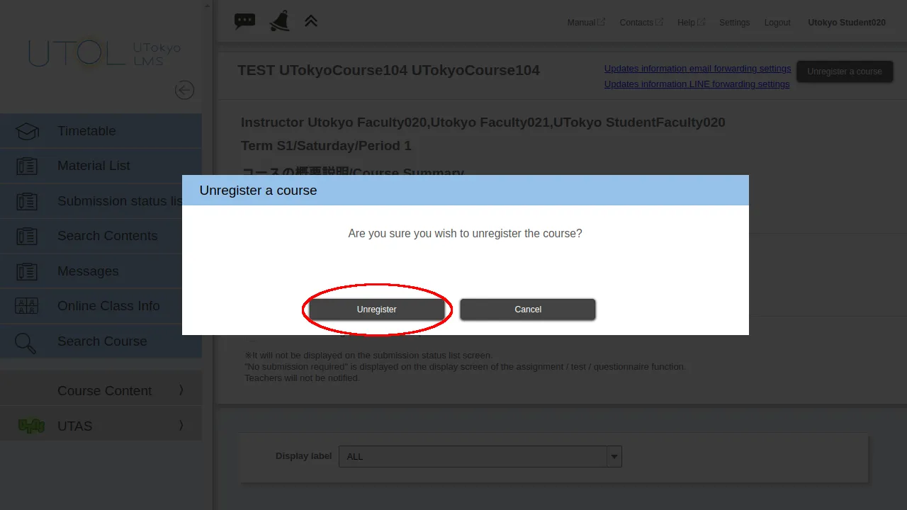 Click the button “Unregister the course” when the dialogue “Are you sure you wish to unregister the course?” is displayed.