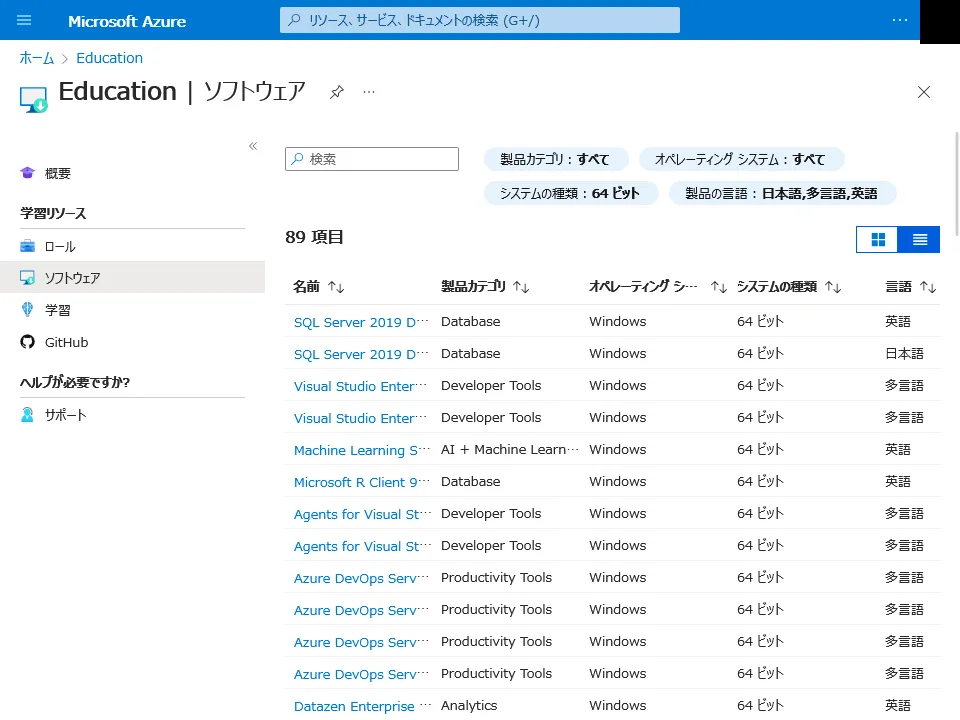 - 「Microsoft Azure」の画面が表示されたら,「Education」画面の左側にあるメニューから「ソフトウェア」を開いてください.
