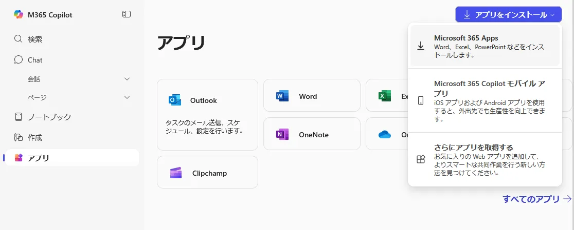 画面の右上にある「アプリをインストール」をクリックして表示されるメニューで,「Microsoft 365 Apps」をクリックしてください.