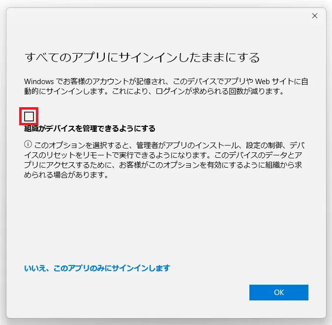 Windowsの場合,「すべてのアプリにサインインしたままにする」というダイアログが表示されることがあります.ここでの設定内容によっては,Officeアプリの利用中にエラーメッセージが発生しうることが確認されています.これを防ぐため,以下のように回答してください.