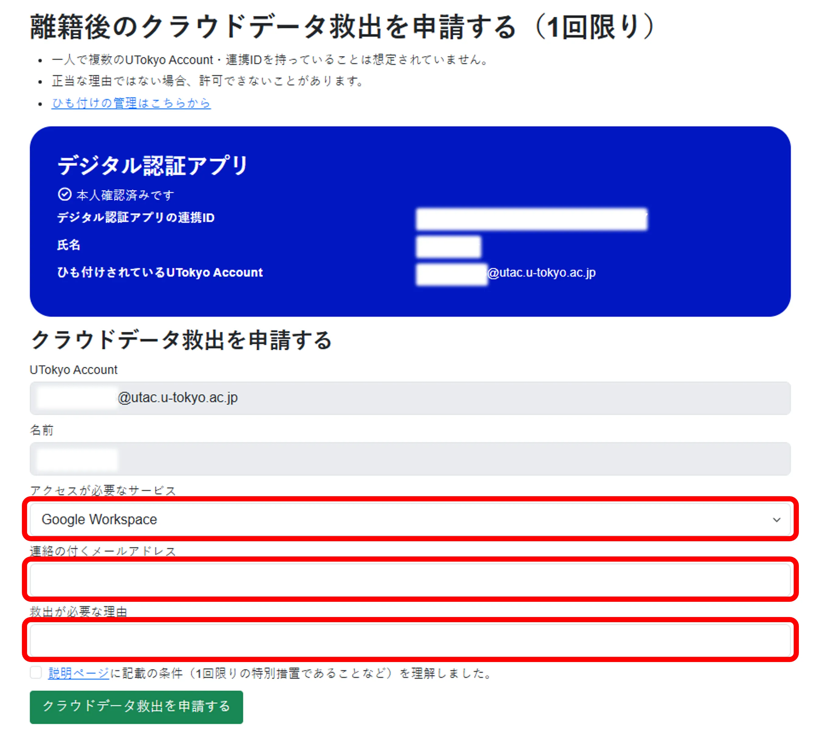 - 「アクセスが必要なサービス」「連絡の付くメールアドレス」「救出が必要な理由」を記入してください.救出を利用するための条件を確認の上「説明ページに記載の条件(1回限りの特別措置であることなど)を理解しました。」にチェックを入れて,「クラウドデータ救出を申請する」を押してください.