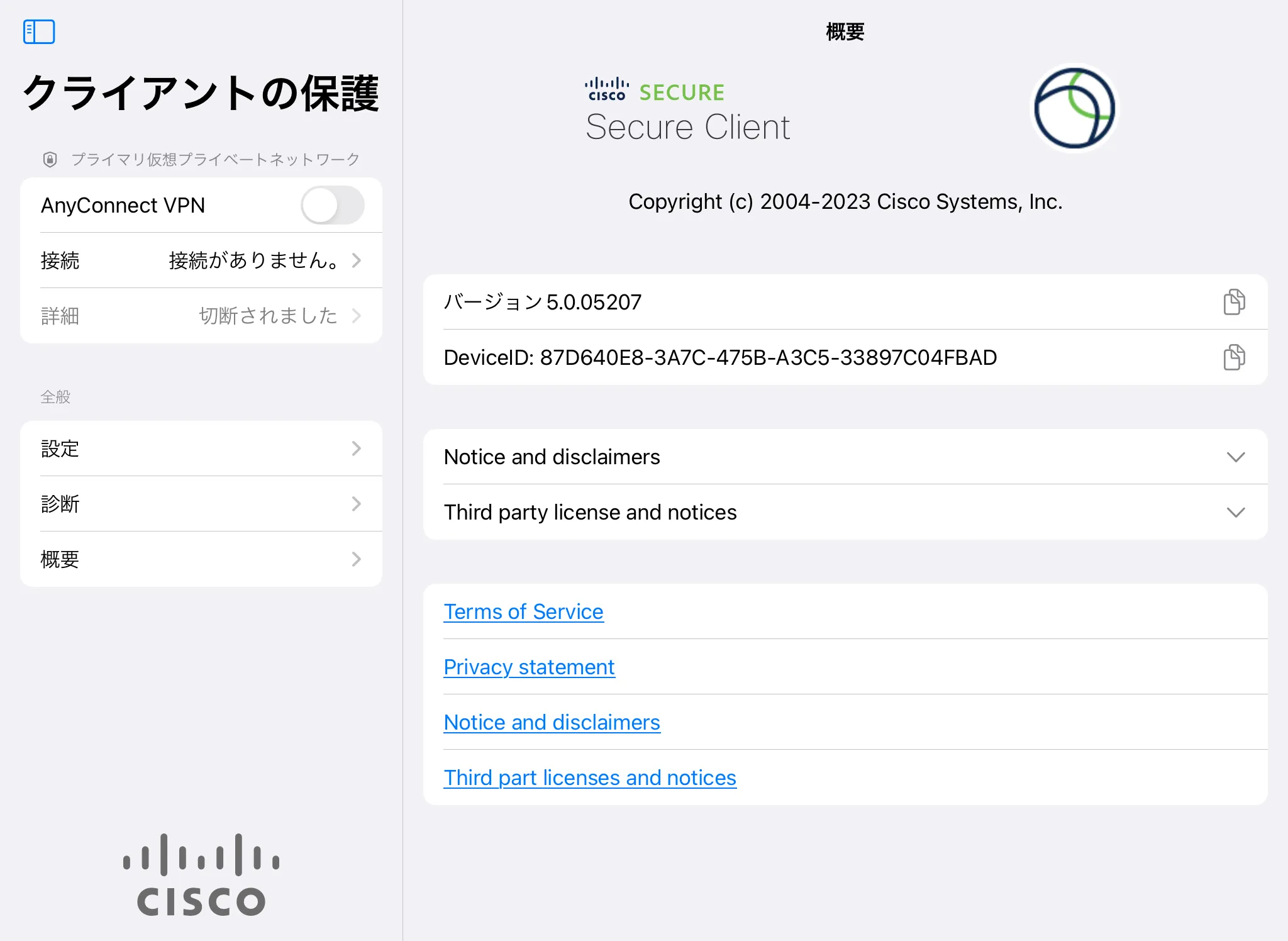 VPNを切断する際は,この画面左上のトグルボタンをタップして「詳細」が「切断されました」になったことを確認してください.