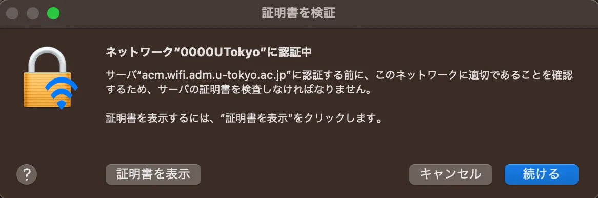 UTokyo Wi-Fiとは,東京大学の構成員が教育・研究を目的として利用できるWi-Fiサービスです.UTokyo Wi-Fiの利用に関する全般的な説明は, UTokyo Wi-Fi全般の説明ページ に記載されています.はじめにそちらを確認した上で,macOS 13 Venturaの端末に即した詳しい手順説明が必要な場合に,このページを参照してください.