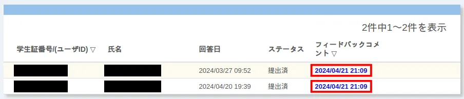 を押し,「回答状況確認」を押してください. - 各回答が表示された表があるので,右側の「フィードバックコメント」列のリンクを押してください.