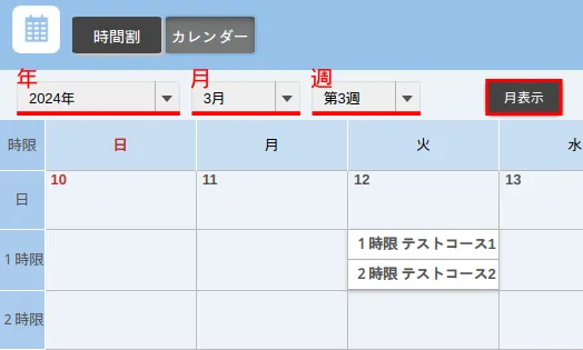 コースは時間割形式またはカレンダーとして表示でき,画面上部のボタンで切り替えられます.