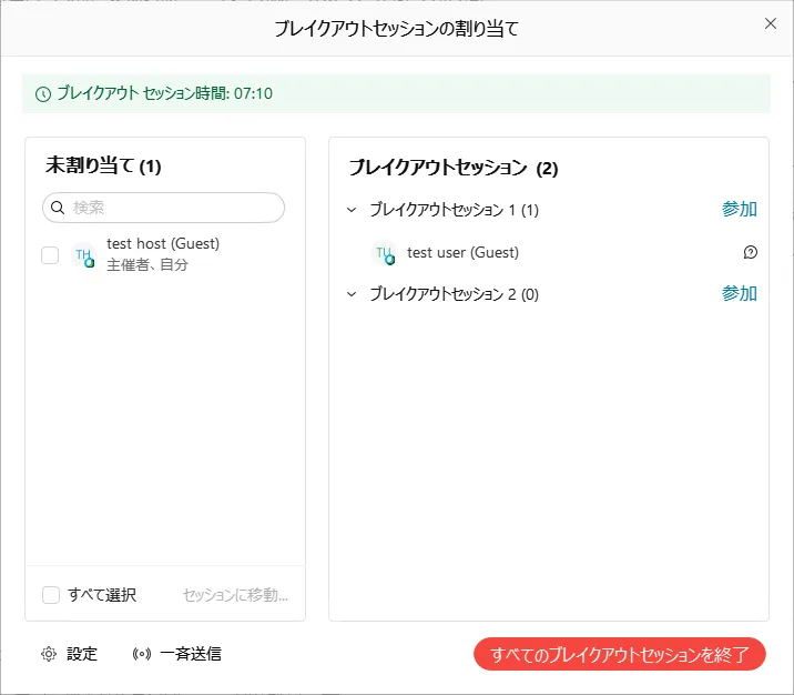 • 「割り当て」をクリックすると,ブレイクアウトセッションの管理ウィンドウが表示されます.