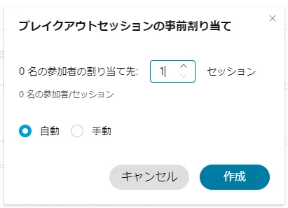 • 「ブレイクアウトセッション」ボタンを押すと,ブレイクアウトセッションの割り当てウィンドウが表示されます.