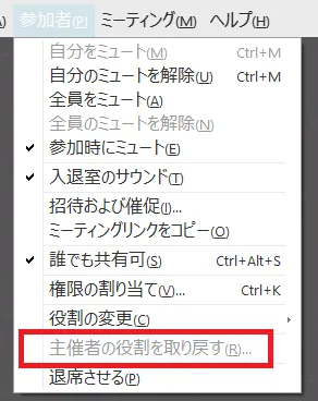 • そんなときは,参加者として再度参加後,「参加者」メニューから「主催者の役割を取り戻す」を押し,会議を作成したときに表示されている「主催者キー」を入力すると,主催者に戻ることができます.