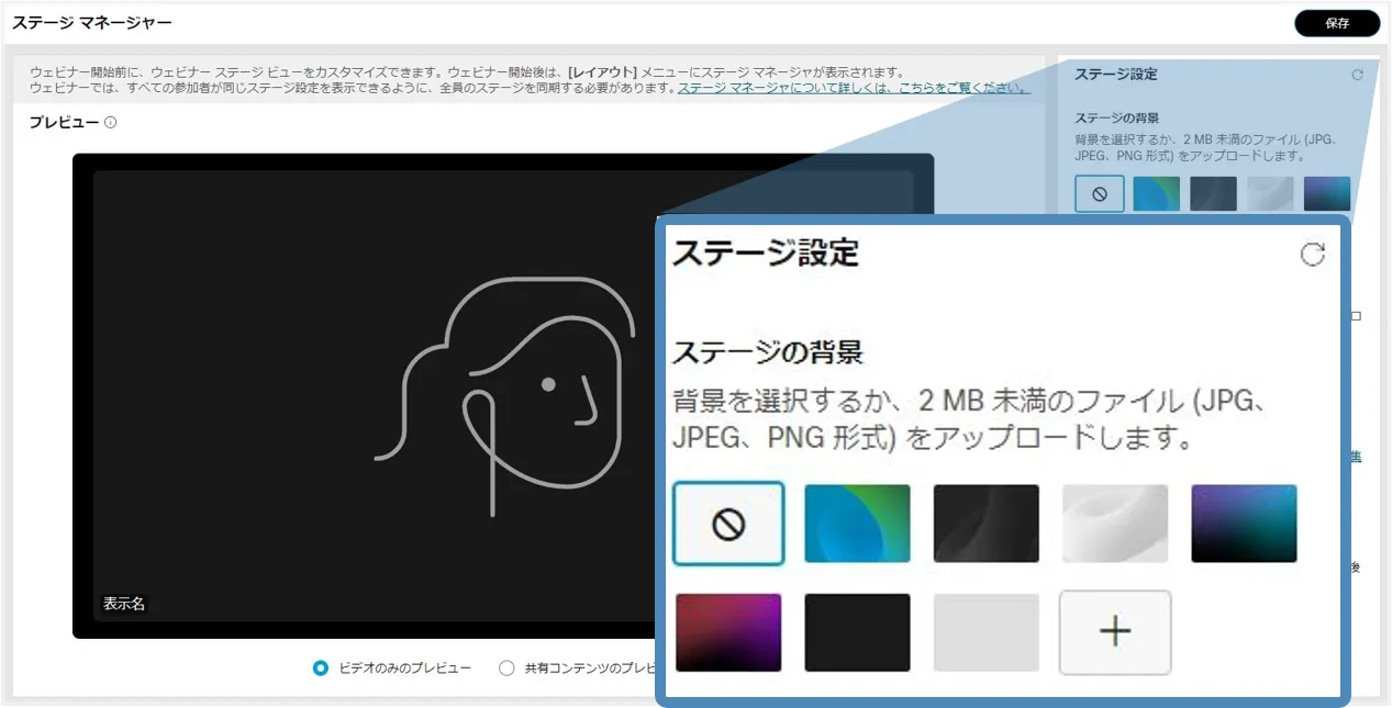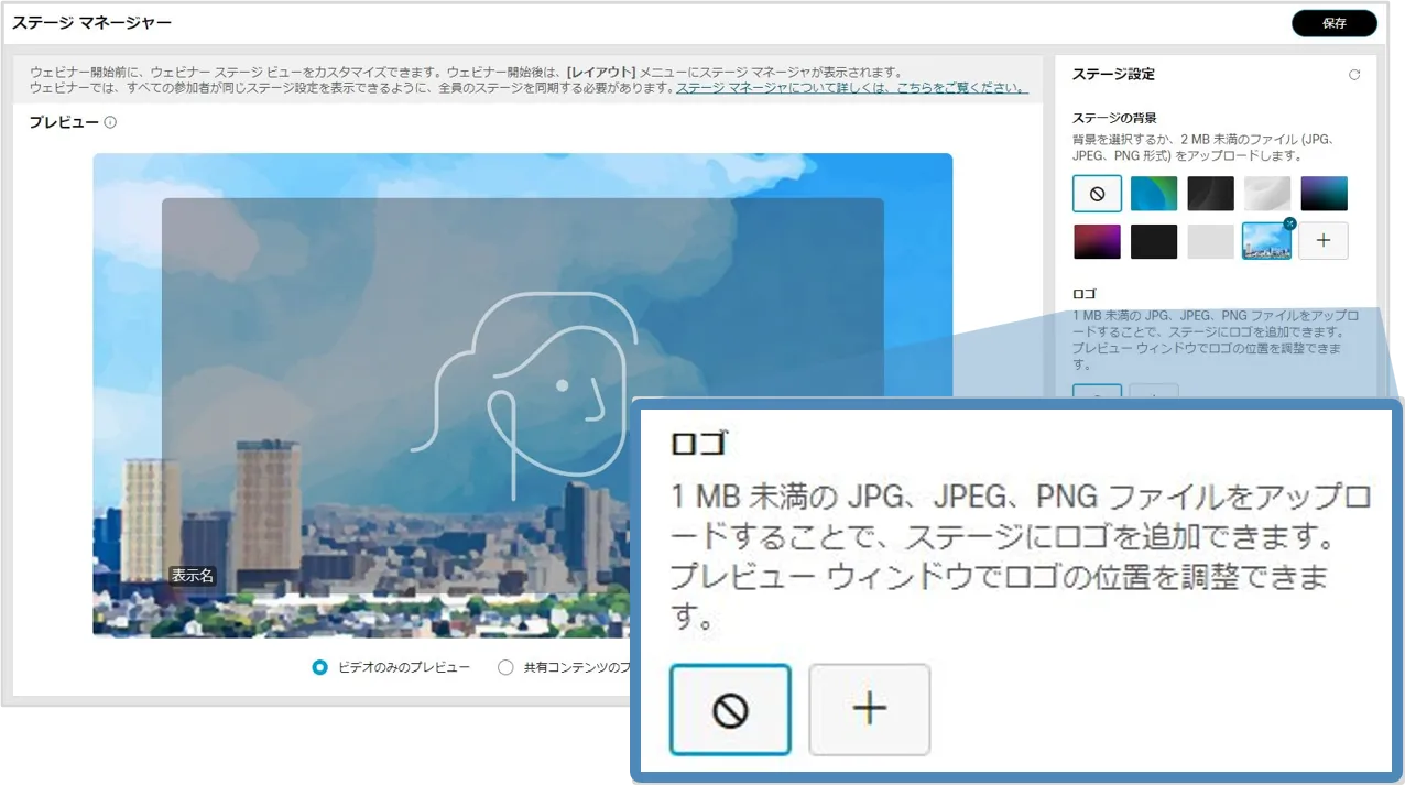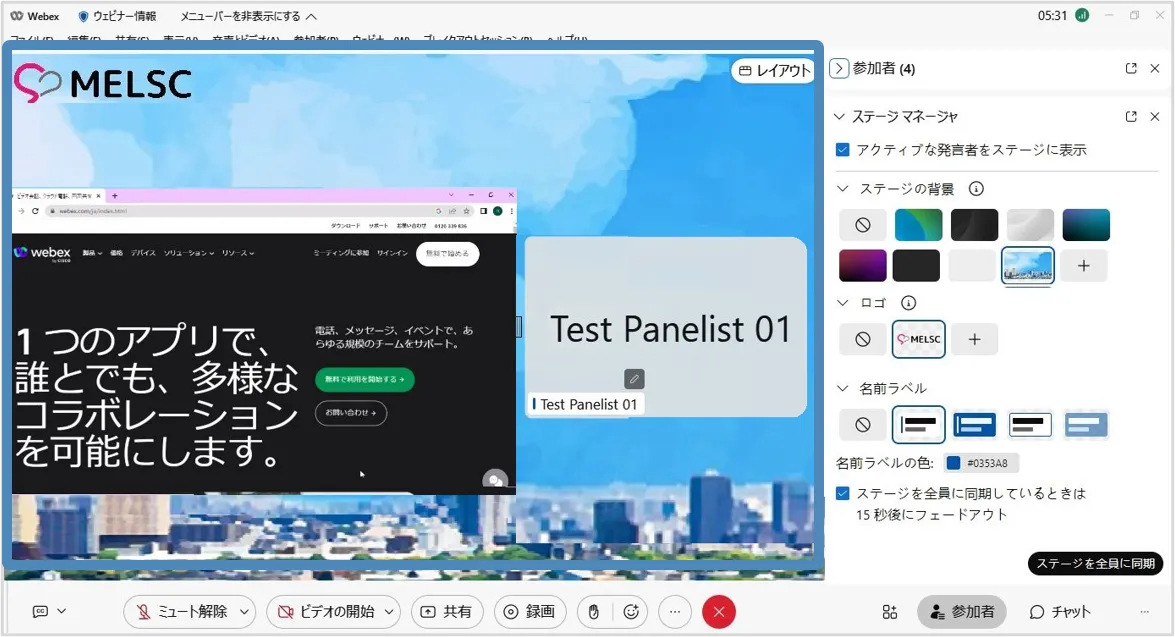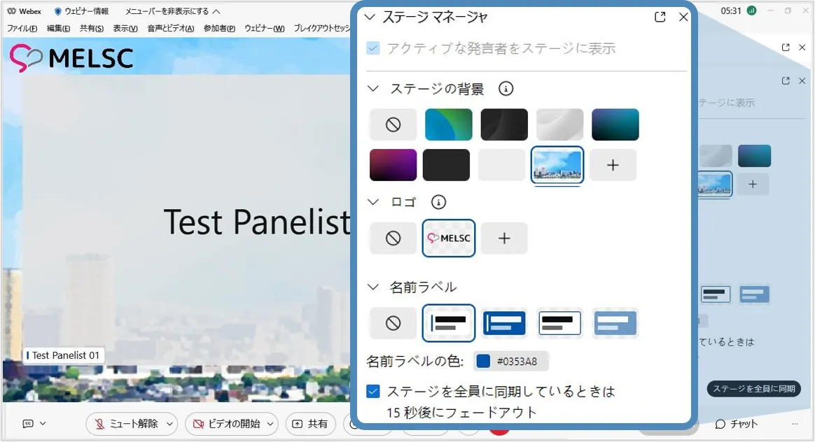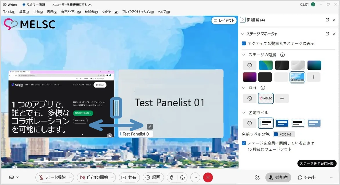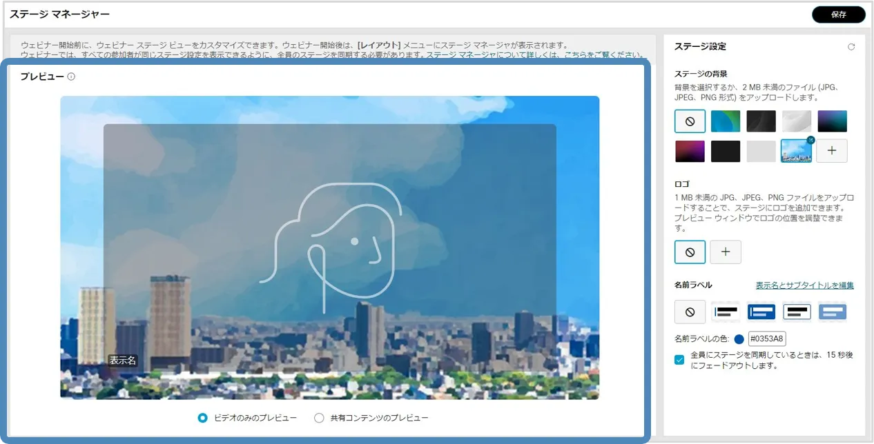 • ステージマネージャー機能を使用すると,背景やロゴ・カスタマイズした名前ラベルをステージに設定でき,効果的なウェビナーの開催に貢献します.