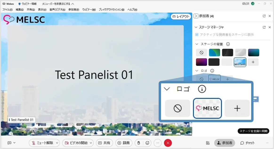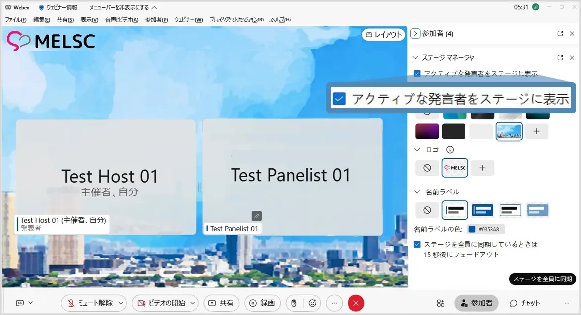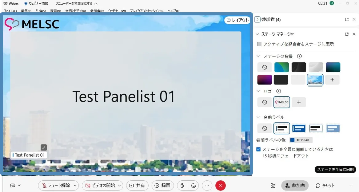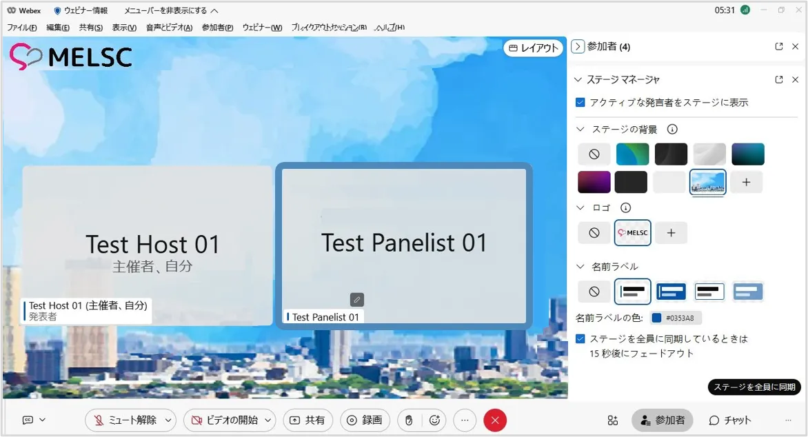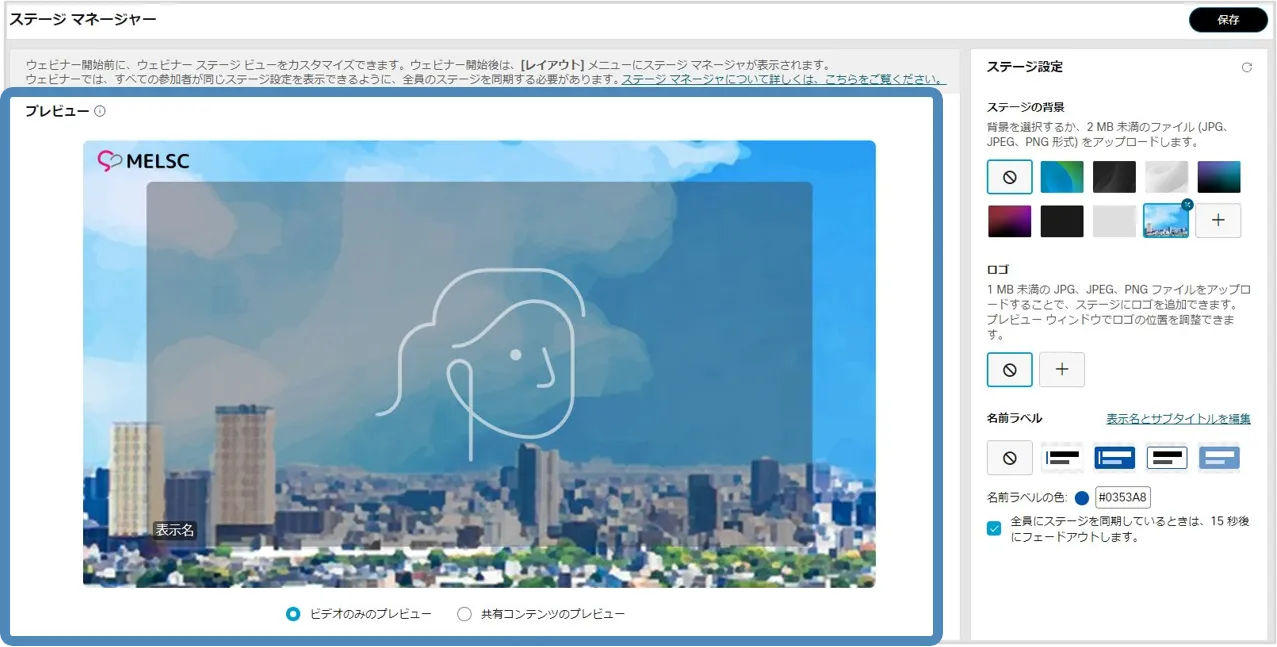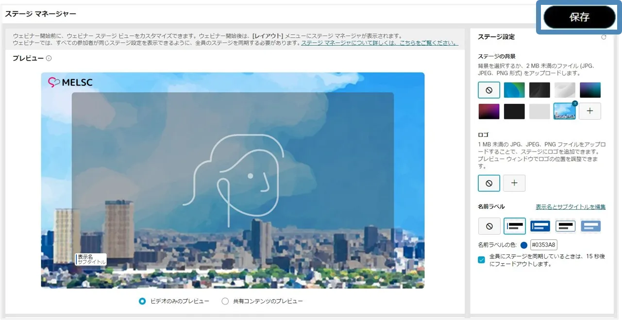 • ステージマネージャー機能を使用すると,背景やロゴ・カスタマイズした名前ラベルをステージに設定でき,効果的なウェビナーの開催に貢献します.