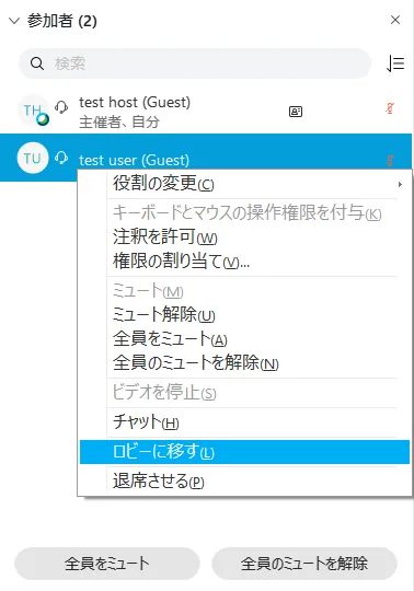 • すでに会議に参加している参加者をロビーに追い出すこともできます.該当の参加者を右クリックして「ロビーに移す」を選択します.このときにその参加者がプレゼンターに指名されていると,追い出すことができません.