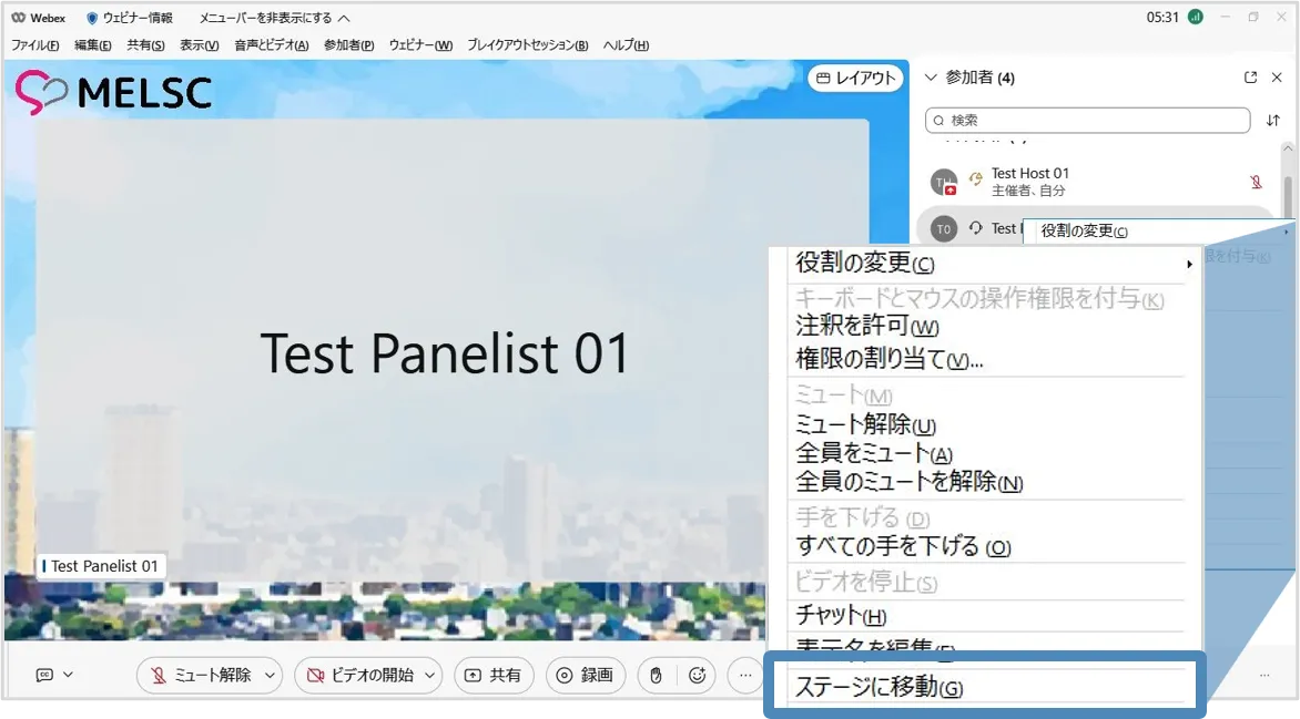 2. パネリストの名前の上で右クリックし,メニューを表示します.メニュー内にある「ステージに移動」を選択します.