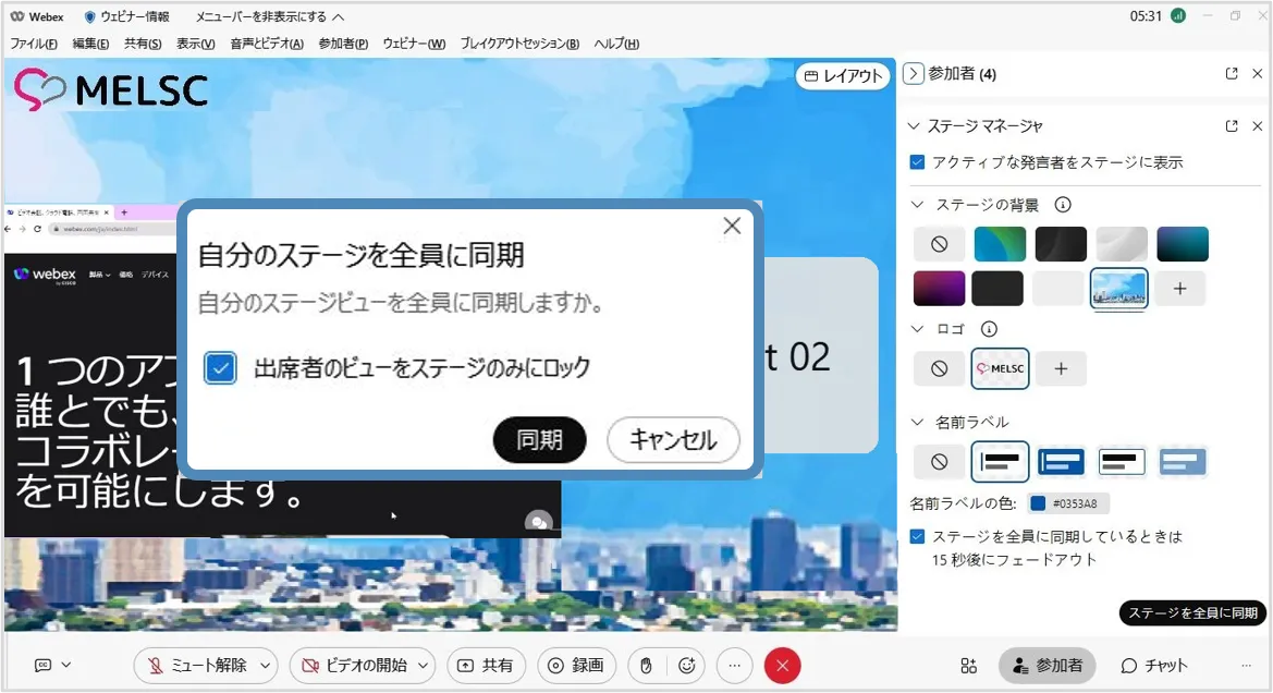 5. 「同期」を選択し,ステージのレイアウトを出席者に同期します.