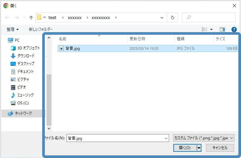 4. 利用したいファイルを選択します.「開く」を選択し,ファイルをアップロードします.