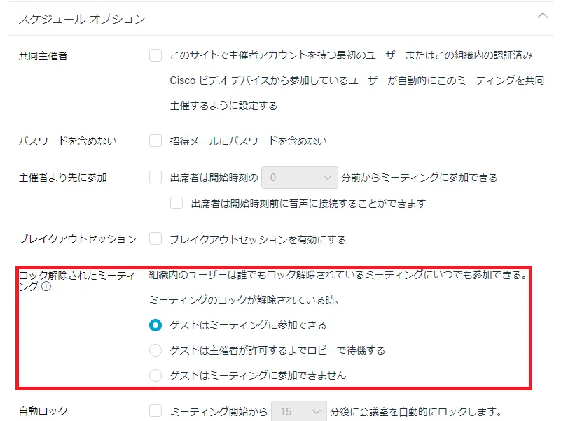 • スケジュール時に設定すると,ミーティングをロックしていない状態でも未登録の(utelecon.webex.comにアカウントを持っていない)参加者が来た時にロビーに送ることもできます.ロックしていない状態でutelecon.webex.comにアカウントを持っている参加者が来た場合は阻む方法はありません.