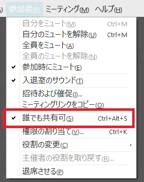 • 「参加者」メニューに「誰でも共有可」という機能があり,このチェックを外しておくと,想定していない参加者からのコンテンツ共有を防ぐことができます.
