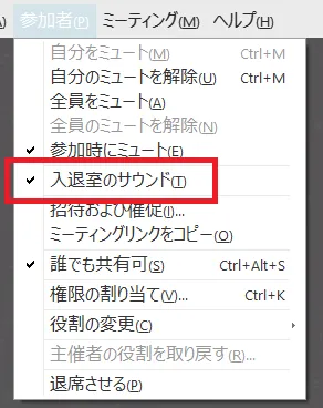 • 「参加者」メニューの「入退室のサウンド」で設定します.