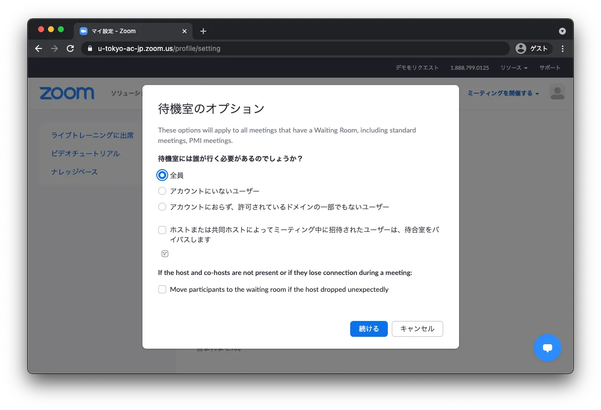待機室機能は,参加ユーザを一旦待機室に入れ,ホストが明示的に入室を許可する機能です. Zoomの設定画面から,待機室に誰を入れるかを設定することができます.