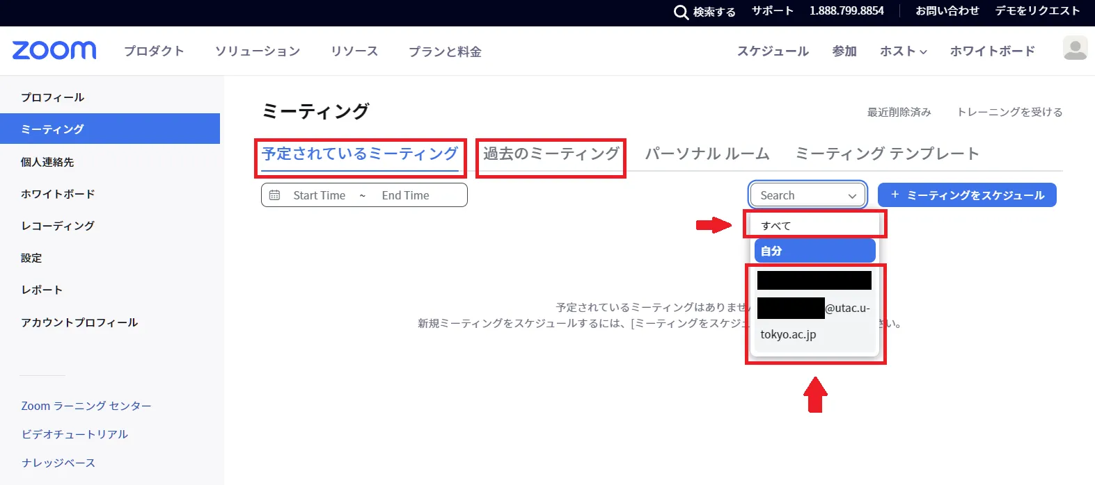 - 「ミーティングをスケジュール」の左側にあるプルダウンメニューから,「すべて」もしくは親ユーザーを選択してください.「すべて」を選択した場合は自分自身のミーティングと親ユーザーのミーティングの一覧が,親ユーザーを選択した場合は親ユーザーのミーティングの一覧が表示されます.