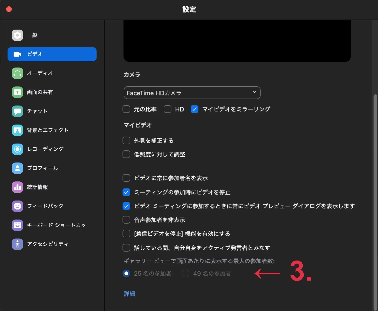 ギャラリービューでは,1画面に表示する最大人数を25人と49人で設定することができます.以下が設定手順です.