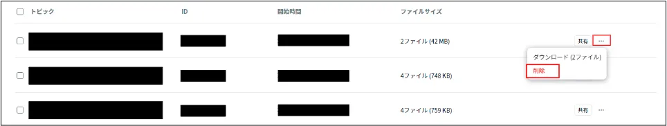 - 削除したいレコーディングの行の右側にある「…」のアイコンを押し,「削除」を選択してください.