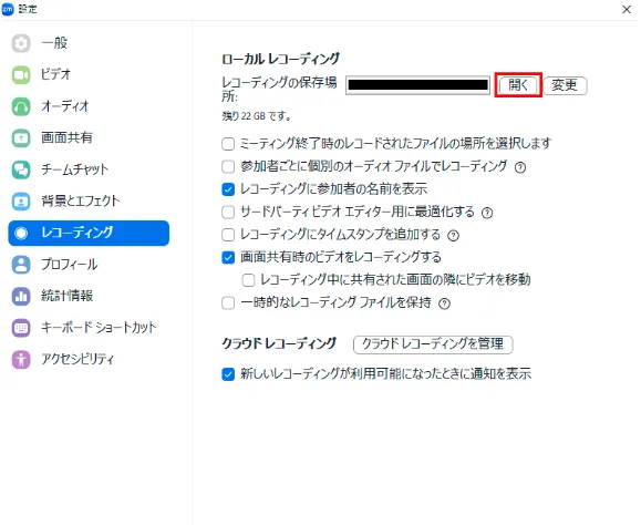 - もし保存されている場所が分からない場合は,Zoomのアプリの「設定」から,「レコーディング」を開き,「ローカルレコーディングの保存場所」の横にある「開く」を押すと,PC等の中で動画が保存される場所を確認できます.