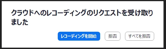 - クラウドレコーディングが行われていない状態で,「クラウドレコーディングを開始するようにホストにリクエストする」を押してリクエストを送信すると,ホストの画面に下の画像のようなダイアログが表示されます.ホストが「レコーディングを開始」を選択すると,クラウドレコーディングが開始されます.